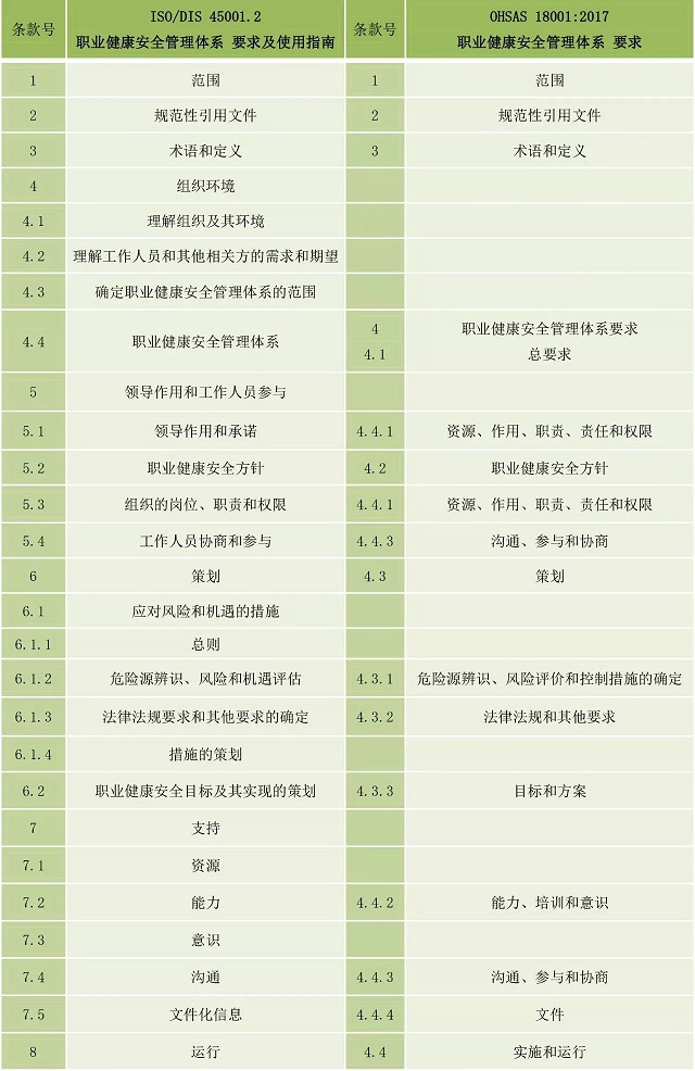 ISO 45001的構(gòu)建是在OHSAS 18001已有的規(guī)范上,其主要目標是相同的,都是為提高組織的職業(yè)健康安全績效。同時,通過以下表1框架的對比,也存如下不同之處: