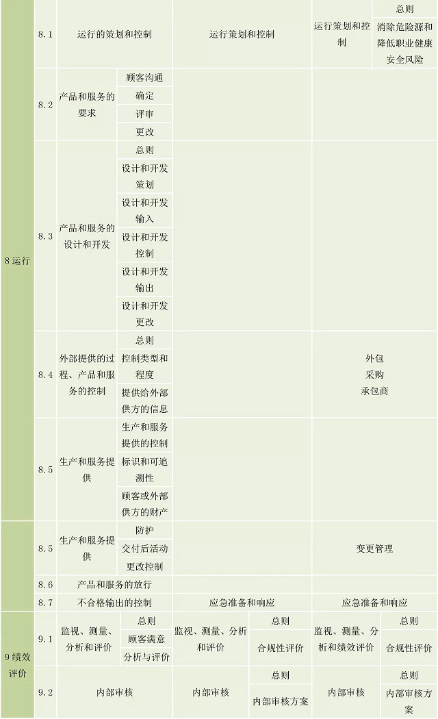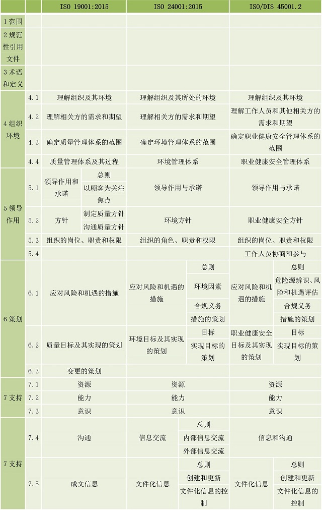 在國內(nèi),組織都是將各個管理體系進行整合,質(zhì)量、環(huán)境、職業(yè)健康安全管理體系作為ISO標準,均使用了高階結(jié)構(gòu),為體系的整合提供了便利。表2將三個體系的框架進行了對應(yīng)于合并,可供讀者參考。